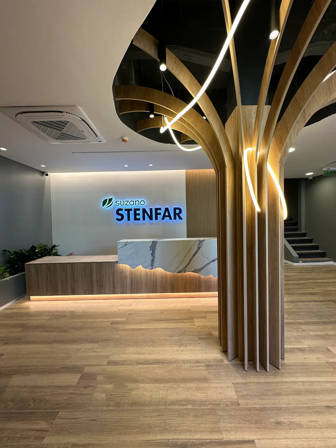 En Suzano STENFAR, diseñamos un espacio de trabajo inspirado en la conexión con la naturaleza y el desarrollo sostenible. La propuesta arquitectónica integra materiales eco-amigables y sistemas de iluminación de bajo consumo, alineados con los valores de sustentabilidad y responsabilidad social de Suzano STENFAR y ACONIF.
